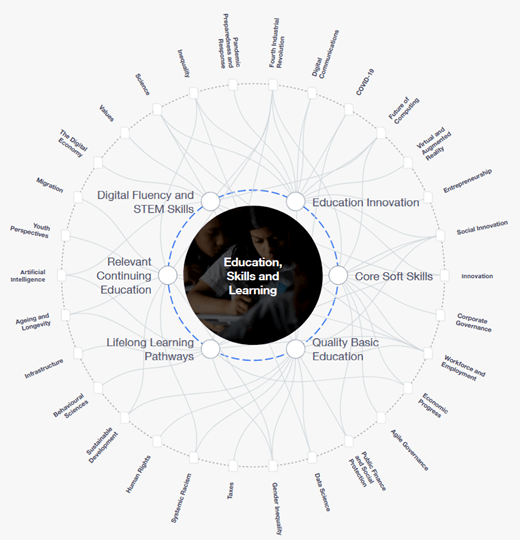 The WEF proposes a competence wheel with six categories to improve quality of education worldwide. The categories are: Digital Fluency and STEM Skills, Education Innovation, Core Soft Skills, Quality Basic Education, Lifelong Learning Pathways, and Relevant Continuing Education.